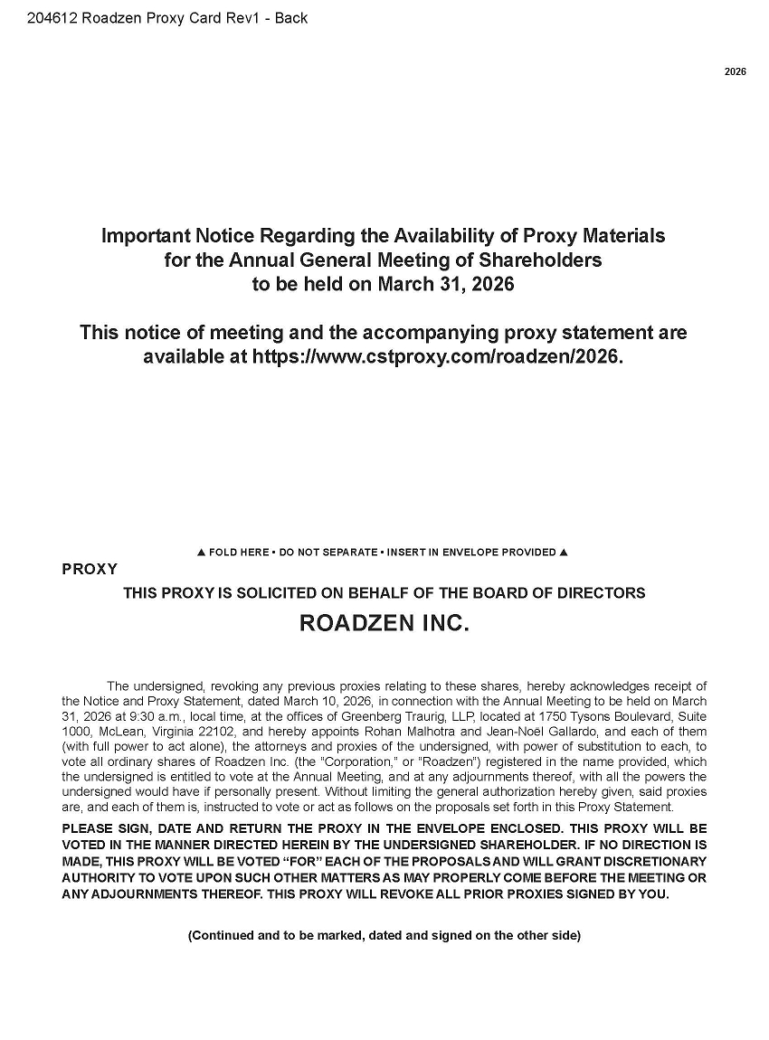 You are cordially invited to attend the Annual General Meeting of Shareholders (including any adjournment, postponement or rescheduling thereof, the “Annual Meeting”) of Roadzen Inc., a British Virgin Islands business company (“Roadzen,” the “Company,” “our,” “us,” or “we”), which will be held on March 31, 2026 at 9:30 a.m. Eastern Time. The Annual Meeting will be held at the offices of Greenberg Traurig, LLP, located at 1750 Tysons Boulevard, Suite 1000, McLean, VA 22102. If you plan to attend the Annual Meeting, please refer to the attendance and registration information in the accompanying proxy statement (the “Proxy Statement”).